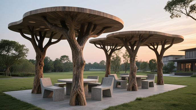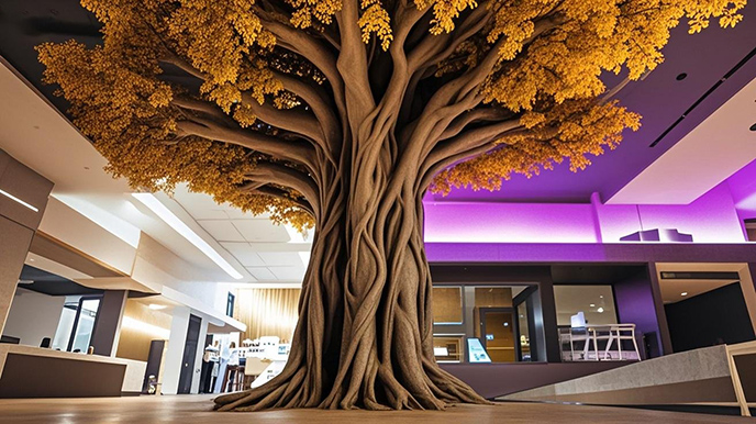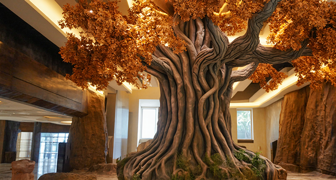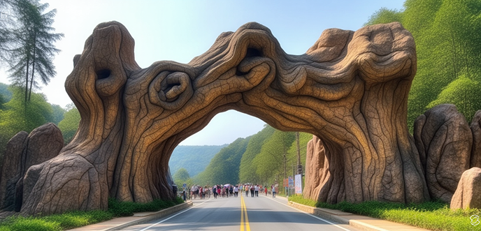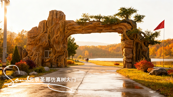 对比来看,设计图虽保留了 “古木” 的意境,但更偏重于视觉美感;修改后的仿真树大门实景则在安全与实用上实现了平衡 —— 加粗的树根让大门更显稳固,主要展现树干骨架美解决了户外仿真树叶维护难题,调整后的灯光既保留了氛围感,又避免了视觉杂乱。这种从 “理想设计” 到 “实景优化” 的转变,让仿真树大门既守住了设计初心,又更贴合园区的实际使用需求。
